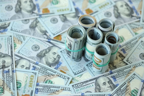 Many rolls of one hundred dollar bills lies on big amount of american currency banknotes