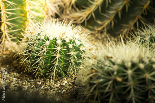 Many small cactus, planted indoor. Cactus in pot arranged in Green house. Home plant need sunshine to grow.