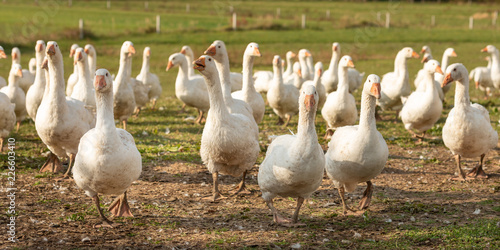 animal, goose, goose, meadow, lot, several, white, meadow, neck, flock, pack, farming, background, vogel, bird, flock of birds, formation, agricultural, farm, outside, nature, fowl, lateral, sideview, run, race, look, foreground, text, autumn, banner, panorama, header, headline, format, happy