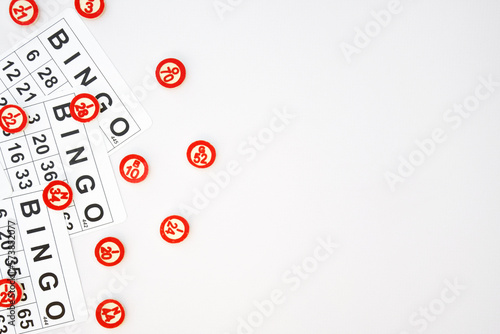 Many wooden chips with numbers and cards for a board game of bingo or lotto on a light background.