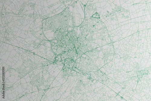 Map of the streets of Gent (Belgium) made with green lines on white paper. 3d render, illustration
