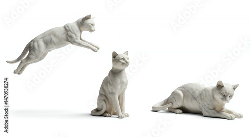 Marble Cat Statues in Various Poses Isolated on White Classical Art Sculptures Perfect for Decoration Showcase Stone Craft Domestic Pets Feline Friend Studio Shot