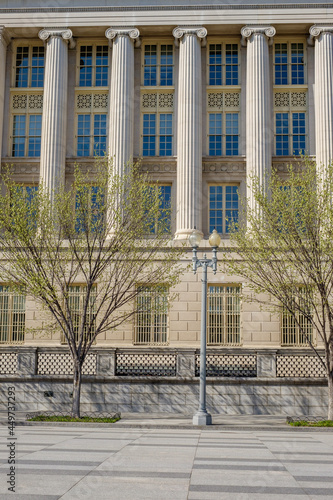 Marble Promenade along Pennsylvania avenue with a restored architectural masterpiece government building and spring trees