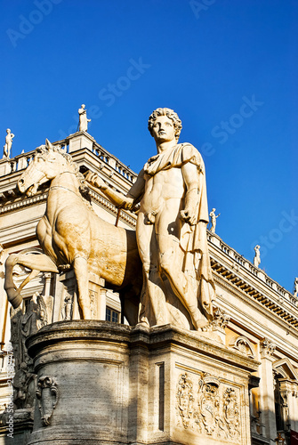 Marble statue of Castor Dioscuri. The sculpture is located on Michelangelo Cordonata stairs and leading to Piazza del Campidoglio. Rome, Italy