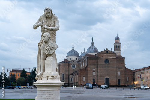Marble statue of doctor perforating another man´s skull decorating public square in the italian city called Padova on a cloudy day