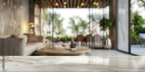 Marble Tabletop in Luxurious Living Room with Greenery