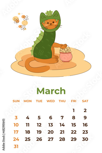 March 2024. Calendar sheet with a cute cat in a dragon costume with a pot of coins. Cartoon vector illustration.