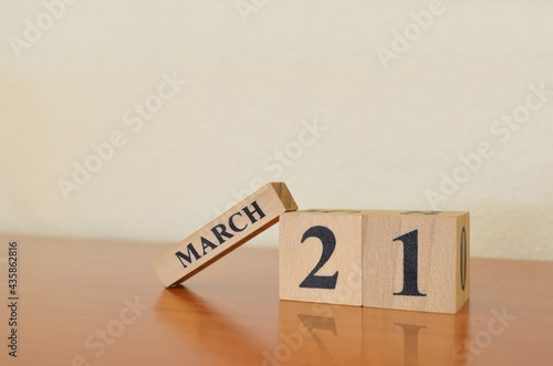 March 21, Date design with calendar cube on wooden table and white background.