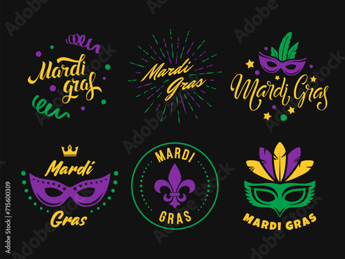 Mardi gras badges. Fat Tuesday logos. Set of vector emblems with handwritten lettering and black background