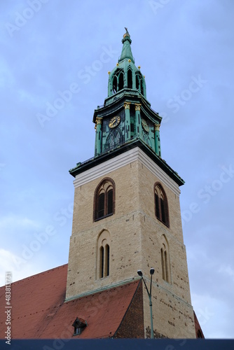 Marienkirche bell tower, Berlin, Germany. St. Mary's Church, known in German as the Marienkirche, is a church in central Berlin, located on Karl-Liebknecht-Strasse, near Alexanderplatz