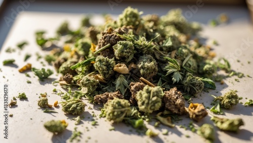Marijuana and Cannabis Shake. Shredded Dried Weed and Bud. Close Crop, Panorama.
