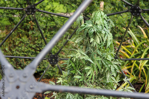 Marijuana plantation enclosed in a kind of iron circle, in the middle of the vegetation
