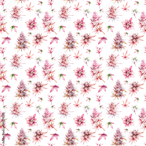Marijuana watercolor seamless pattern with natural cannabis leaves. Cannabis golden leaves. Cannabis branch illustration. Medical marijuana. Weed set