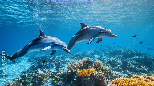 Marine ecosystem showing dolphins corals fish interacting in clear blue waters