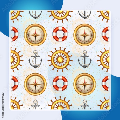 Marine symbols seamless pattern with steering wheel anchor lifebuoy and compass vector illustration