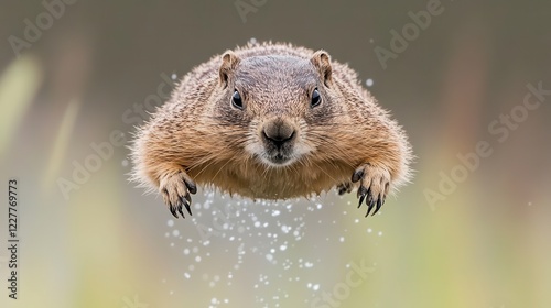 groundhog, water, animal, wildlife, nature, mammal, rodent, leap, jump, paw, claw, fur, droplet, splash, blur, background, cute, adorable, funny, playful, active, energy, wild, free, spring, summer, photo, image, photo, picture, fauna, creature, small, brown, grey, wet, happy, cheerful, bright, vibrant, life, scene, moment, capture, sharpened, sharp, detail, texture