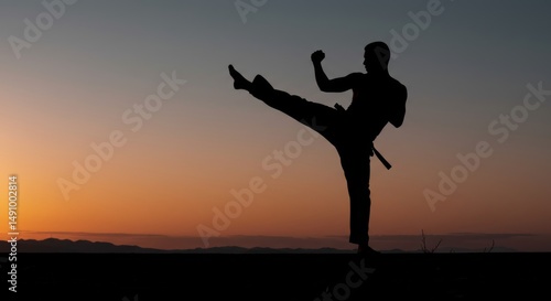 Martial Arts Silhouette Kick in Golden Sunset, Focused and Empowered