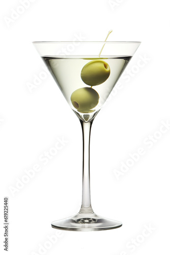 Martini drink with green olive on it over white transparent background