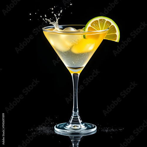Martini Glass with Lemon Slice and Ice Splash Effect, Ideal for Cocktail Menus, Beverage Advertising, and Elegant Drink Presentation