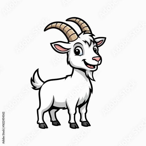 Mascot logo of a cute goat stands cheerfully on white backdrop, cartoon rendering. Mascot logo design shows friendly animal character with white fur, curved horns, and gentle smile. Mascot logo,