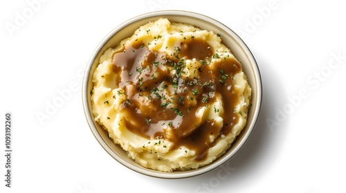 Mashed potato gravy herbs topping in a modern ceramic bowl top down shot, white background, mashed, crushed, ingredients, vegetarian