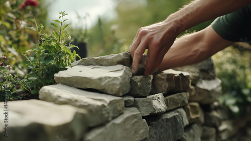 mason, building, stone, garden, wall, highlighting, masonry, landscaping, construction, project, design, closeup, hand, placing, stone, visible