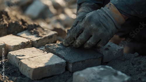 mason, laying, brick, construction, site, strength, skill, masonry, work, progress, building, optical, hand, carefully, place, mortar, spreading, glove