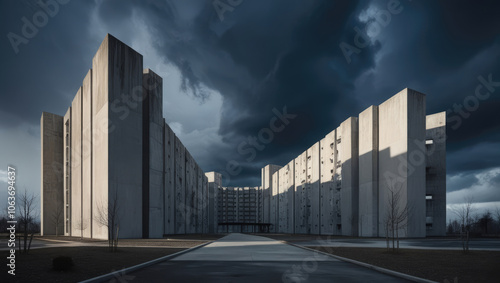 Massive Concrete Building with Brutalist Architecture Against Dark Stormy Sky