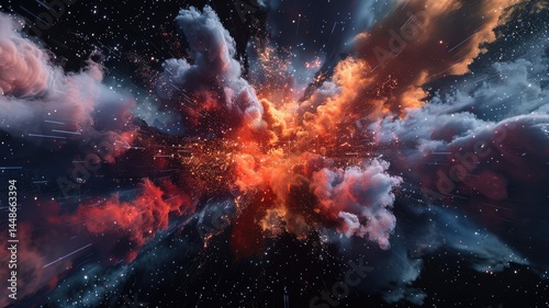 Massive explosion with colorful smoke in space. Explosion scene with vibrant color smoke. Dramatic and vibrant visual effect with sparks. Background for wallpaper, banner, and print. Dynamic. AIG53.