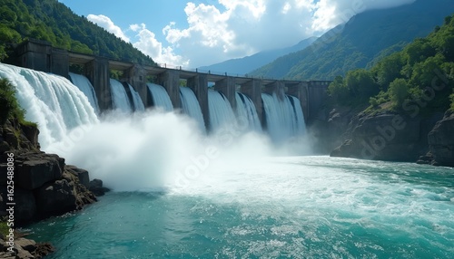 renewable energy, power generation, infrastructure, dam, water, energy, electricity, flowing, green energy, sustainability, man-made, structure, engineering, environmental, technology, power, supply, river, reservoir, management, plant, mountain, landscape, forested, hill, sunny, day, clear, sky, outdoors, natural, resource, conservation, ecological, storage, background, copy, space, turbulent, blue, clean, hydro, curtain, waterfall, beauty