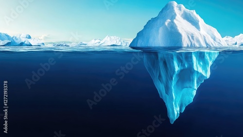 Massive iceberg with submerged section in deep blue ocean against clear sky, illustrating nature's hidden depths
