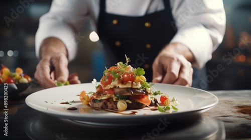 Master chef cook man hands precisely cooking dressing preparing tasty fresh delicious mouthwatering gourmet dish food on plate to customers 5-star michelin restaurant kitchen close-up detailed artwork