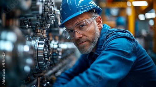 Master of Machines: A seasoned engineer, adorned in safety gear, meticulously inspects intricate machinery in a bustling factory setting.