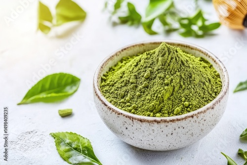 Matcha powder in a bowl, surrounded by fresh tea leaves