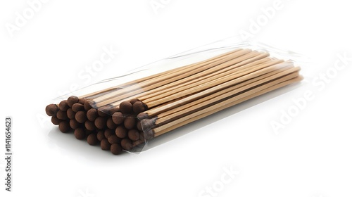 match, stick, wood, brown, fire, light, ignition, package, plastic, enclosed, isolated, white, background, safety, fuel, flames, burn, heat, kindling, combustible, flammable, emergency, survival, camping, tool, equipment, accessory, domestic, household, useful, essential, supply, item, object, product, photo, image, picture, graphic, design, illustration, texture, detail, closeup, macro, view