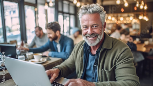 mature adult man, businessman with a promising career, at the laptop sitting in a cafe or restaurant, or digital nomad, having fun and enjoying working at the job
