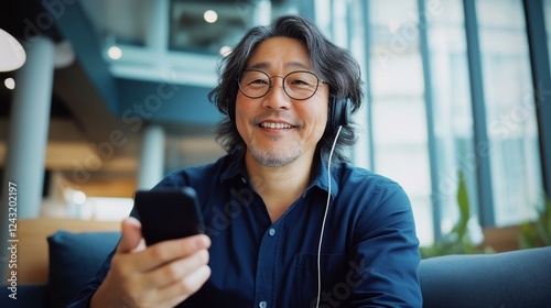 businessman, asian, earphones, smartphone, smiling, office, manager, mature, happy, technology, communication, connection, music, listening, mobile, phone, cyberspace, work, business, corporate, professional, modern, interior, sitting, sofa, indoor, window, natural, light, goggles, cheerful, positive, success, achievement, confidence, executive, leader, entrepreneur, freelance, remote, workplace
