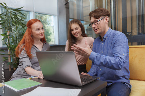 Mature businessman discussing business strategy with female co-workers