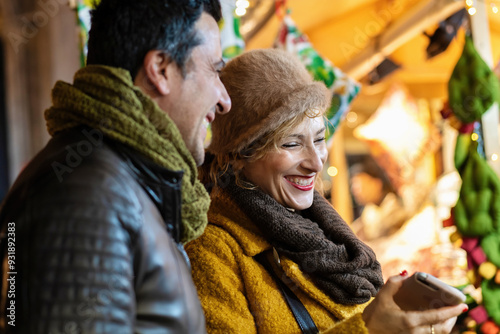 christmas, market, couple, holiday, festive, mature, joy, togetherness, smile, winter, smartphone, foulard, coat, light, decoration, seasonal, love, evening, cold, technology, human relationships, celebration, happiness, enjoyment, leisure, lifestyle, diversity, inclusion, adult, vacation, travel, tradition, culture, life events, cosy, atmosphere, entertainment, date, night, romance, shopping, warmth, bonding, memory, authentic, candid, real people