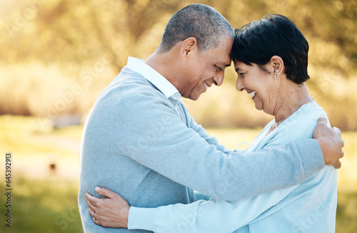 Mature couple, hug and love in garden for happy date, holiday and relax together in retirement. Man, woman and embrace with smile in park, nature and support of freedom, trust and loyalty to partner
