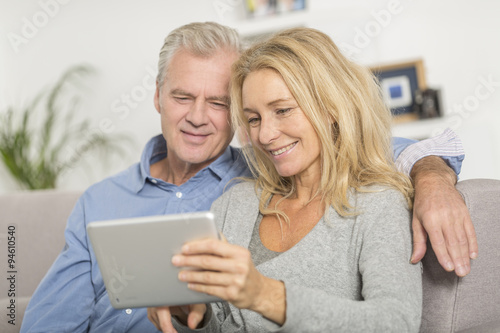 40s, 50s, adult, lover, caucasian, european, happiness, complicity, man, woman, middle-aged, smile, couple, relaxing, inside, house, sofa, cyberspace, online, electronic mail, blond, cyberspace, white hair, grey hair, generation, married, wife, husband