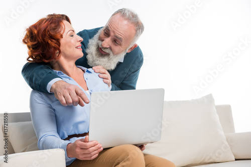 computer, horizontal, love, people, happiness, caucasian, friendship, man, couple, woman, laptop, together, togetherness, using, attractive, casual attire, photogenic, mature, senior, closeness, hugging, embracing, human relationships, redhead, bearded, two people, isolated on white, front view, middle-aged, grey hair