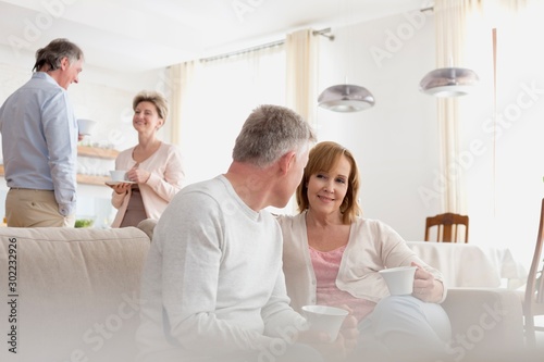 Mature couples talking in living room at home