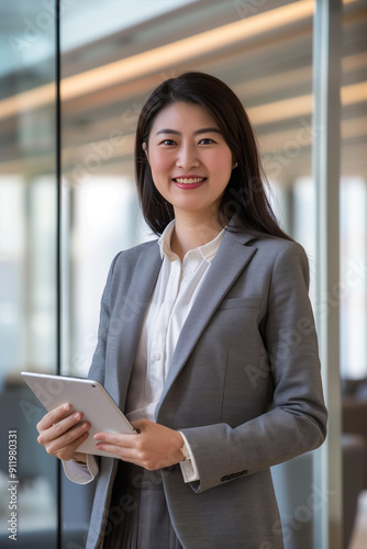 Mature Japanese businesswoman smiling in an office, holding a tablet, recruitment