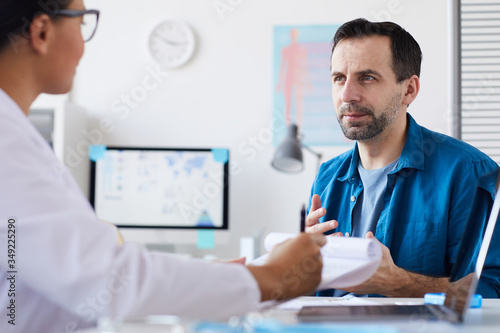 Mature man discussing his health with his female doctor while they sitting at the table at office