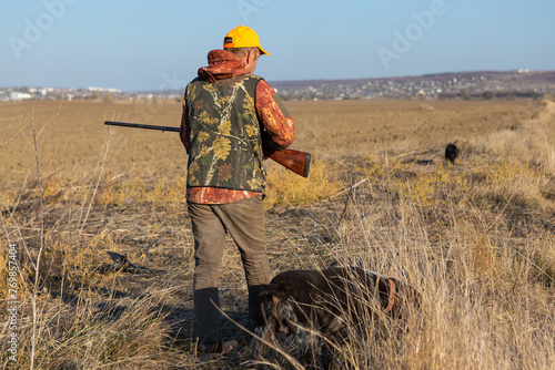 man, hunter, rifle, shotgun, camo, bird, aiming, lifestyle, vest, reflective, autumn, shooter, duck, gun, hunting, weapon, shooting, sport, nature, shoot, soldier, hunt, aim, target, field, outdoors, army, camouflage, military, person, pointer, german, spaniel, walking, man, pheasant, human, leisure, wildlife, countryside, recreation, forest, dog
