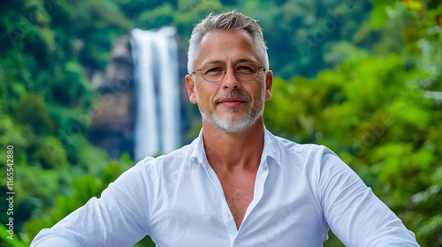 Mature Man Smiling Outdoors Near Lush Green Waterfall Background