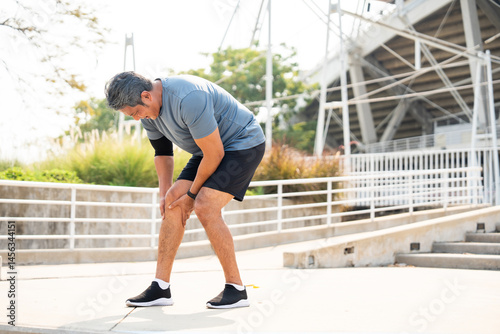 Mature man tired and leg pain during jogging at sport stadium. Runner has sore knees because he has been running for too long. Exercising until the injury. Training athlete work out at outdoor.