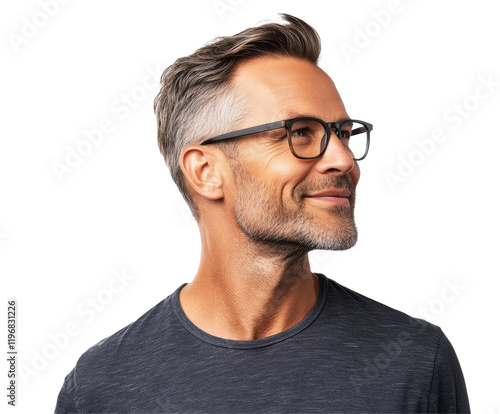portrait, thoughtful, confident, modern, spectacle, goggles, mature, on, dignified, background, man, smiling, happy, closeup, adult, stylish, half face, pensive, looking away, gentle, grey hair, white, isolated