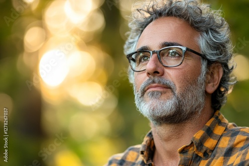 Mature man with glasses reflects in a serene outdoor setting during golden hour in autumn